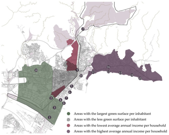 From the identification of urban areas with informal sports activity, their relationship with the areas of the city according to income level and the surface of green areas per inhabitant in each of them has been contrasted (see Figure 3). From this comparison, a relationship is established between the surface of green areas per inhabitant and/or qualified public spaces, income level and level of sports activity. Thus, in the neighborhoods next to the sea promenade, there is a high concentration of informal sports activity, coinciding with high-income neighborhoods (such as neighborhoods in the eastern part of the city, as it can be seen in Figure 3). Urban areas with a high rate of green areas per inhabitant (as in the cases of neighborhoods in the western part of the city, see Figure 3) have a high level of income and moderate sports activity according to mappings made through the use of the digital platform. On the contrary, urban areas with the lowest rate of green areas per inhabitant have a low-income rate and less sports activity according to data recorded through the platform (see Figure 3). These relationships raise a possible lack of equity in access to urban spaces that facilitate sports practice for the population, an issue that should be considered in the planning of urban, social and sports policies.