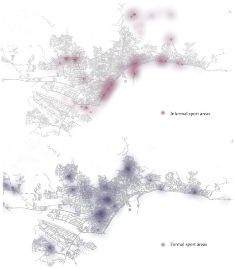 Likewise, mapping of intensity of sports activity in the city have been developed, distinguishing between formal and informal sports activity (see Figure 4). In relation to formal activity, a balanced and sufficient distribution of municipal sports facilities can be seen in the different neighborhoods, with some exceptions, such as in the eastern part of the city with fewer facilities, which is justified by a lower population density. In relation to informal sports activity, a contrast is observed between those urban areas with a high concentration of informal activity, as in the case of the sea promenade, and other areas with hardly any sports activity, coinciding with low-income neighborhoods and lack of qualified public space. The comparison between the provision of regulated sports facilities and the informal sports areas can be a useful instrument in order to identify urban areas with greater difficulties for practicing sports.
