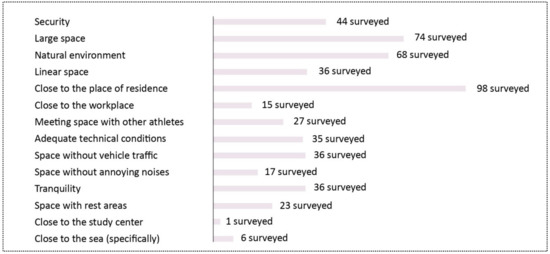 Some initial conclusions can be established from all the interviews conducted regarding the characteristics of the urban space that invite the citizens to do sport in a specific place, as shown in Figure 5. A total of 20 face-to-face interviews have been made on people that were doing sport in the public space and 190 interviews online. The following results shown correspond to the online interviews. A total of 40.1% of the people interviewed were young people aged 15 to 40, and 55.2% between 40 and 60, and the remaining 4.7% were aged over 60. It is planned to expand the sample of people online surveys in the development of the research, although the first results obtained offer interesting information as indicated below.