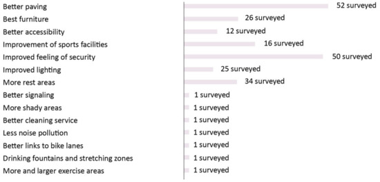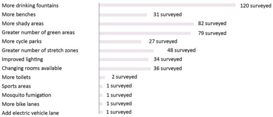 Other information of interest from the surveys, and through the ActivaMálaga digital platform, is focused on establishing the needs to improve the urban spaces for sports practice. This information can be very valuable for the authorities in charge of urban design and fostering sport in the city, as it is tool to establish demand in real time. Some of the most common demands of the users are listed below (see Figure 6):