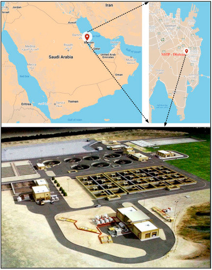 Dhahran North Sewage Wastewater Treatment Plant (DWWTP) is located at the Dhahran district of Eastern Province, Saudi Arabia (26°18′31.18″ N 50°9′40.87″ E) (Figure 1). DWWTP is an activated sludge wastewater plant and receives only domestic wastewater with an average flow rate of 52,012 (±4440) m3/d. The wastewater flow enters the DWWTP via gravity sewers from three areas: Doha residential area, Saudi Aramco Dhahran facility, and King Fahd University of Petroleum and Minerals (KFUPM) campus area. The influent first contacts with mechanically cleaned step screens followed by vortex grit removal chambers. A flow equalization tank is used to balance the peak flows. After that, the screened and de-gritted wastewater flow is distributed to the aeration tanks, where the biological stabilization of organic matter is accomplished. The aerated effluent exiting the aeration tanks is conveyed to secondary settling tanks for the removal of solids. The belt filter press units have been used for sludge dewatering of excessive sludge.