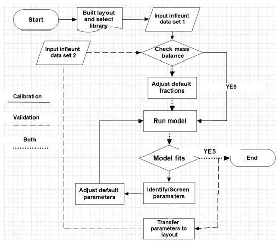The influent data for month 1 (as presented in Table 2) was employed as the calibration simulation input data. Meanwhile, for the model validation, the period covering three months (months 2–4) was used as the input data. The schematic steps for the systematic model calibration and validation adopted in this study are illustrated in Figure 2. The standard statistical, as elaborated earlier, was undertaken (as provided in Table 1), and the calculated confidence intervals were found to be within a 90–95% significance level. The simulations were performed under steady-state conditions for both model calibration and validation processes. The best-identified parameters proving collective matching of measured plant effluent quality data, i.e., total COD, BOD5, NO2− + NO3−, NH3−N and TN for the calibration, were then applied on the for validation simulations undertaken for the different periods (month 2, 3, and 4). The steps for the DWWTP plant steady-state systematic calibration process are explained as follows.