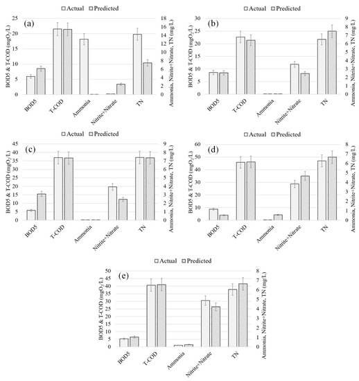 Figure 9b,c reveal similar trends for BOD/TN and COD/TN ratios, which indicated better DWWTP performance when the ratios are kept comparatively at higher values. This corroborated earlier findings that showed high COD/TN > 5.5 is desirable for achieving efficient nitrogen removal [53]. Similarly, BOD5/TN < 4 suggests nitrification occurring as a separate process for domestic wastewaters, whereas the BOD5/TN > 4 combined approach is more likely to occur [44].