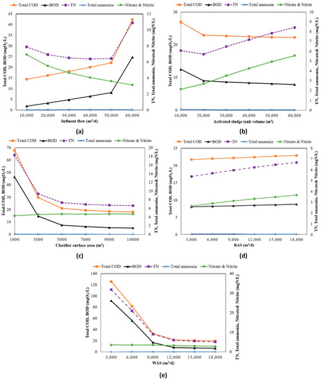 Influence of (a) influent flow (b) activated sludge tank (AST) volume (c) clarifier surface area (CSA) (d) recycle activated sludge (RAS) (e) waste activated sludge (WAS) on DWWTP capacity and performance.
