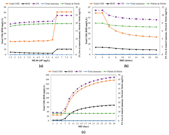 As critical ASP design and operating parameters [38], the influence of MLSS, hydraulic retention time (HRT), and SRT on DWWTP performance are presented in Figure 6. For that, the treated water effluent and the sludge flow lines were employed for the assessments of the performance of the DWTTP. The MLSS trend shown in Figure 6a suggested that the plant could maintain its performance over an appreciable range of MLSS of up to 6000 mg/L. Even though above this MLSS value, the BOD5 and nitrogen components removal will insignificantly be affected, yet there could be a dramatic increase in the COD components. This can be attributed to the sudden increased in the TN in the final effluent when the MLSS reached 6000 mg/L. While the model indicated that higher HRT resulted in better COD and TN removals (Figure 6b), in contrast, higher SRT are prone to significantly undermine the ability of the DWWTP to eliminate both COD and TN (Figure 6c) despite its effectiveness in ammonia-N removal under the various investigated operational parameters. The modeling data suggest that the condition for better performance is when the plant was set to operate at HRT > 6 h and SRT < 7 days. Results presented by Elwaad et al. [35] indicated better nitrification and denitrification when operated at SRT of 7 days, in agreement with the present study. However, other similar studies reported higher SRT values of up to 15 days [24,39,41].