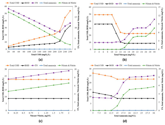 The results depicted in Figure 7a show that the CODout and BOD5out increases proportionally, with increasing CODin concentration. Meanwhile, at lower CODin the inhibition of effective nitrification and denitrification is manifested in the higher effluent nitrogenous parameter concentrations that decrease as the CODin increases [38]. As the CODin reaches beyond 250 mg/L, there was a tendency for CODout and BOD5out to breach the regulatory limit of 50 mg/L and 40 mg/L, respectively. This was also the case for the TN, which started to drastically increase at the 250 mg/L CODin inflation point (Figure 7b). Considering that most of the average influent of the plant was far below this threshold (ranged between 129.05–215 mg/L), this implies that the plant performance was satisfactory for the handling even higher influent organic loadings. While the increase in influent total (NO3− + NO2−) insignificantly influenced both nitrogen and carbonous compounds degradation (Figure 7c), however, lower influent TN (Figure 7b) was susceptible to result in higher CODout and BOD5out (near the discharge limits) which could drastically reduce at higher TN values before stabilizing when the TN was beyond 14 mN/L.