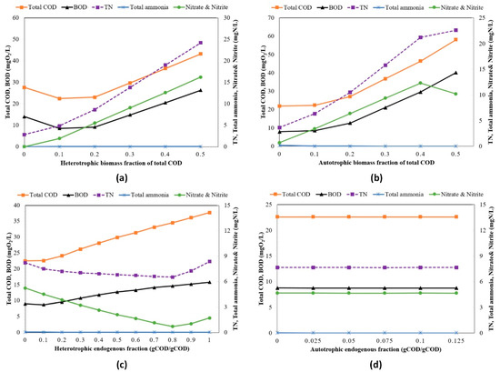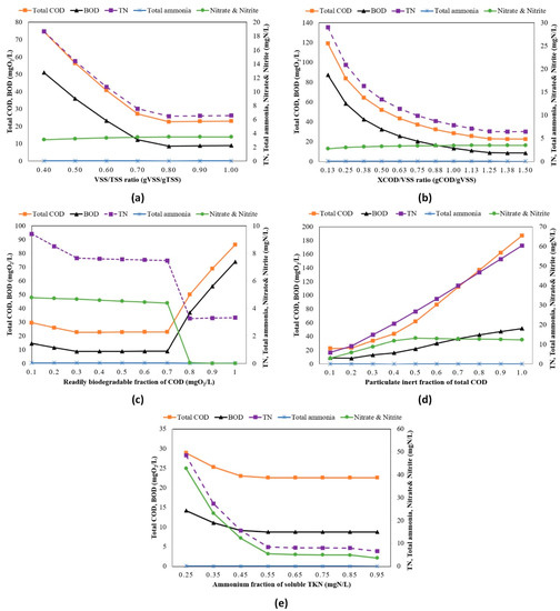 Meanwhile, as the Xi = 0.12 and Si = 0.0556 are comparatively low, the model assumes that the higher proportion of the sbCOD (i.e., soluble biodegradable particulate and colloidal COD) effectively underwent extracellular enzymes hydrolyzation and availability for biomass assimilation [30]. On the other hand, Figure 8e shows the relevance of Snh (i.e., NH4/TKN ratio) on TN removal, which suggests that for acceptable plant performance, the Snh should be kept above 0.55. Meanwhile, the Snh has a lesser influence on the CODout and BOD5out, and increasing it improves the effluent quality, which steadied for Snh > 0.45. For both the nitrogenous and carbonous quality parameters, the obtained simulated values of the Snh for the plant data follow the GPS-X default value of 0.9. The ASM1 model adopted in this study considers both XND and XS as transformed into SS and SND, respectively, via hydrolysis [5,45], which is evident from the presented results.