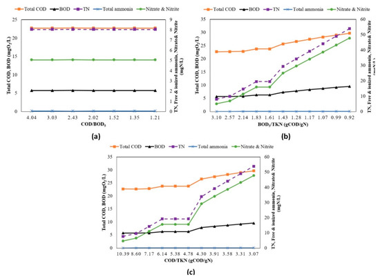 Influence of (a) COD/BOD5 (b) BOD5/TKN and (c) COD/TKN ratios on DWWTP capacity and performance.
