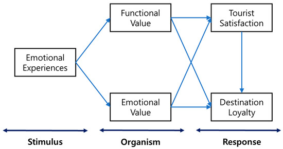 An increasing number of studies in tourism including sport tourism have recently examined the effects of emotional experiences on outcome variables such as intention. In investigating tourist behaviors, the stimulus–organism–response (SOR) theory has become one of the most widely used theories by incorporating input (S), processes (O), and outputs (R) for decades [21]. In sport tourism contexts, a few studies have employed SOR theory to elucidate sport tourists’ behaviors [22,23]. These studies considered emotions (nostalgia) to be stimuli, and their influence on attitudinal components (organism) and consequence behavioral intention (response) were examined. Although findings of these studies provide useful insights in investigating sport tourists’ behavior, emotions from the experience of past sporting events were the main factor, not for the current experiences. Therefore, these findings may not be suitable to predict behaviors of sporting event participants. Based on the SOR theory, the present study explored relationships between emotional experiences (S), functional and emotional values (O), and tourist satisfaction and destination loyalty (R) to predict behaviors of active sport tourists.