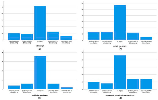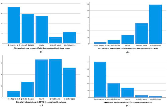 - Attitude towards bike-sharing in the post-COVID-19 era: it contains five-point Likert [38] scale questions about respondents’: (a) perceived risk of infection while using bike-sharing services in comparison with other transport modes (i.e., private car, public transport, taxi, walking), (b) opinion concerning aspects of bike-sharing safety (e.g., disinfection of vehicles by operators), (c) willingness to use less- or more-frequent bike-sharing services in the post-COVID-19 era.