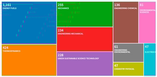 Based on the information provided in Figure 11, summary Table 11 is provided in order to analyze the most frequent sources for publications on the topic of ISCC. The information was sorted in terms of the total number of documents. As it can be observed, Energy Conversion and Management was the preferred platform for ISCC publications (158 documents) whereas Solar Energy was the source that received more citations (4438 citations). In order to normalize that information, the ratio of citations per document was introduced. As can be observed, papers published in Renewable and Sustainable Energy Reviews received the highest number of citations, with almost 54 cites per published document on average, followed by Solar Energy, with almost 44. On the other side, ‘Energies’ showed the lowest ratio, where each of their ISCC related publications (33 documents) received an average of four citations.