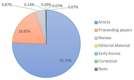 It must be pointed out that the number of publications indicated between brackets is not cumulative, since the same work might be classified under different categories in the WOS. Further refinement was applied in order to exclude the retrieved references that were related to different Integrated Solar Technologies, such as PV-only research. After that refinement, the total number of publications retrieved was 1277, which constitutes the data corpus for this study. Further insight into this search is shown in Figure 2, where it can be observed that 75.7% of the retrieved documents were journal articles, 18.9% were proceeding papers, and less than 5% were review papers. Editorial material, early access, corrections and notes accounted for less than 1% altogether.