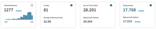 Figure 4 shows the summary report generated by the ISCC search on the WOS. As it can be observed, for the time period of the analysis, ISCC publications were cited 28,201 times in total in 17,768 different items indexed within the Web of Science Core Collection. Removing self-citation, that number was reduced to 24,934 citations in 17,010 different items. Dividing the sum of the times cited by the total number of publications results in an average of 22.08 citations per item, as can be observed in Figure 4.