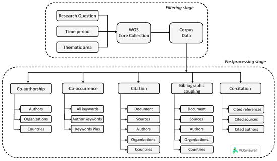 For the data analytics, the data corpus retrieved from the WOS search was exported, including the full record and cited references to be analysed using the graphics analysis software. Save to other formats, the full record and cited references, and all of the data from those papers were exported, and were analysed using graphics analysis software. The VOSViewer [48] software tool was chosen, since it is a free software for constructing and visualizing bibliometric networks, and it also offers a text mining functionality that can be used to construct and visualize the co-occurrence networks of the relevant terms extracted from a body of scientific literature. These networks may for instance include journals, researchers, or individual publications, and they can be constructed based on citations, bibliographic coupling, co-citations, or co-authorship relations. A diagram of the methodology followed in this work can be found in Figure 5. As it can be seen, the first stage was comprised of filtering the data using the research question, time period and thematic areas applied to the WOS Core Collection. The result of that filtering stage is the corpus data of the ISCC topic. That corpus data was analysed applying different bibliometric indicators and using the VOSviewer tool for networking mapping.