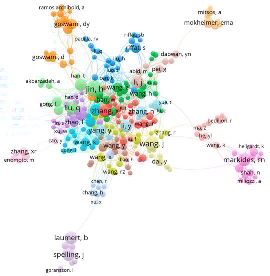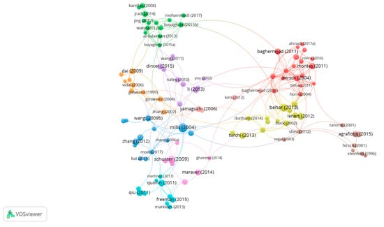 As it can be observed in Figure 6, some western authors appeared to be duplicated since they signed their documents using different initials, which is considered as two different authors by the software. The software allowed us to get rid of a researcher’s first name and replace it by its initial, which would lead to an incorrect analysis, mainly with regard to Asian researchers. In order to verify the quality of the results, the generated table of authors was analysed, and the duplicate cases were revised, such as the ones found corresponding to renowned authors I. Dincer, who also published as Ibrahim Dincer; A. Steinfeld, who published as A Steinfeld; or D. Yogi Goswami, who also appeared as Dy Goswami. Applying that filter to the co-authorship network, a version of Table 2 including the top authors in ISCC was created. Another interesting parameter that can be deduced from Table 2 is the average number of citations each ISCC paper from those renowned authors received. As it can be seen, the highest ratio corresponds to D. Goswami and A. Steinfeld, with more than 50 citations for each ISCC paper, while the lowest ratio for the top 10 author list is 6.7 for B. Laumert at The Royal Institute of Technology, KTH.