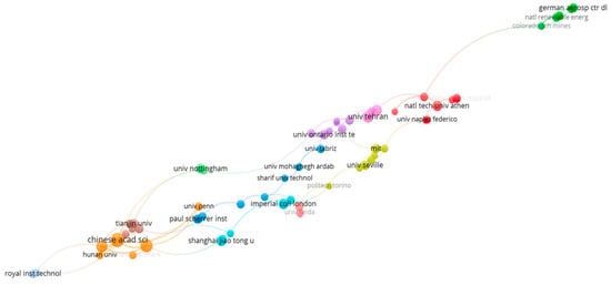 A minimum number of 5 publications (and 10 citations) were chosen for the bibliometric analysis, which resulted in 85 nodes. Some of them were not connected in the network, since they did not meet the publication criteria or did not cite any of the other filtered groups. Therefore, the largest set of connected items (69) was represented instead in Figure 7. Based on that figure, the different collaborations among the institutions can be observed. This kind of analysis is relevant because it allows scholars to identify the main institutions publishing on ISCC (nodes size) and linking relations (citations) among them. For example, Universidad Politécnica de Madrid had joint publications in ISCC together with Universidad Carlos III and UNED. Meanwhile, North China Electric Power University had joint publications in ISCC together with Hunan University, the Chinese Academy of Sciences, Tianjin University, Nanyang Technology University, Huazhong University, the University of Pennsylvania and the Technical University of Denmark. Table A2 from Appendix A contains the detailed information about the clusters shown in Figure 7.