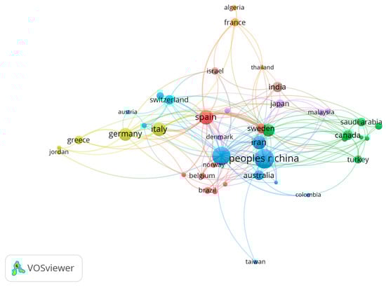 From Figure 8, the level of collaboration (nodes linking) among different countries in joint publications regarding the chosen criteria (at least five joint publications with a minimum number of 10 citations per country) can be deduced. In the case of Spain, its node is connected with another 19 nodes: France, Israel, India, Egypt, Canada, England, Sweden, Iran, China, the United States, Denmark, Norway, Belgium, Chile, Greece, Germany, Italy, the Netherlands, and Switzerland, which confirms a high level of collaboration with other countries in joint publications. On the contrary, Algeria only had joint publications with France (meeting the chosen criteria), and Jordan only had publications with Poland and United States.