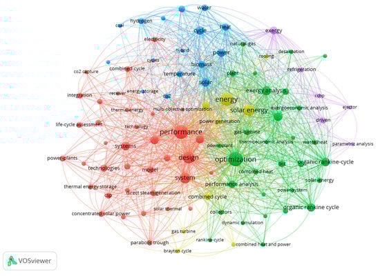 For the network graph representation, the 100 most common keywords were chosen, as can be seen in Figure 9. As it can be observed, most of the keywords are related to modelling topics based on keywords like ‘optimization’, ‘design’, ‘exergy analysis’, ‘thermodynamic analysis’, ‘multiobjective optimization’, ‘model’, or ‘simulation’. Apart from those common keywords, some others, such as thermoeconomic analysis, performance analysis, exoergonomic analysis or parametric analysis also appeared in Figure 9. Despite the abundance of keywords related to modelling and simulation, another series of keywords related to different technologies such as direct steam generation, CO2 capture, hybrid plants, biomass or desalination also appear which gives an idea of combined applications of ISCC with other technologies. This kind of analysis and graphical representation is relevant because it allows us an understanding of the connection (co-ocurrence of keywords) between the topics of ISCC research. As it can be observed, a clear interest for low and medium temperature applications of ISCC is also evident from the occurrence of keywords such as ‘parabolic trough’, ‘organic Rankine cycles’, ‘combined heat and power’ and ‘cooling and refrigeration’. Table A4 in Appendix A contains detailed information about the clusters shown in Figure 9.