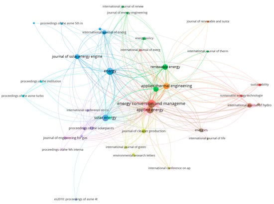 Based on the sources—which means journals and indexed conference proceedings at the WOS—a total number of 129 different sources were retrieved for ISCC related publications. Figure 11 shows the network mapping for all of the sources with five or more publications in common (41). Nevertheless, the largest set of connected items that is represented in the network numbers 39. That map also contains information about the relevance of each node (publications of each source) and the connection between the journals. This refers to which journals were cited by each node; for example, publications from the Sustainability node cited publications from Renewable Energy, Energy, Applied Energy, Energy Conversion and Management, Sustainable Energy Technologies and Energy Technology, or vice-versa, which is translated as a link between those nodes. This kind of analysis and graphical representation is relevant because it allows us an understanding of which sources are the most cited, and how those sources are connected (citations) amongst themselves. Table A6 in Appendix A contains detailed information about the clusters shown in Figure 11.