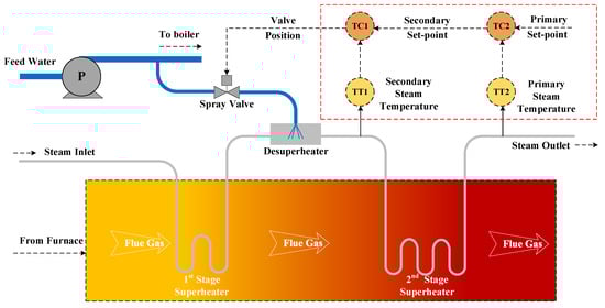 As a key parameter in the operation of power plant boilers, superheated steam temperature (SST) is of great significance to the economic and safe operation of the unit. On the one hand, a superheated steam temperature that is beyond safe range will have an adverse impact on the unit. On the other, steam with a lower superheated steam temperature will reduce the efficiency of the whole plant and bring about safety problems such as carrying water in the last stage of the turbine, which may damage the last stage blades. A superheated steam temperature higher than the set-point level will cause unrecoverable damage to the steam tube, regardless of whether the overtemperature was long-term or short-term [,], even causing the unit to shut down. Therefore, the superheated temperature needs to be adjusted within a limited operating range. It is generally recommended that the fluctuation range of superheated steam temperature is ±5 °C from its set-point [,]. On the other hand, even if the above conditions are met, frequent temperature variation will still produce thermal stress, resulting in metal failure.