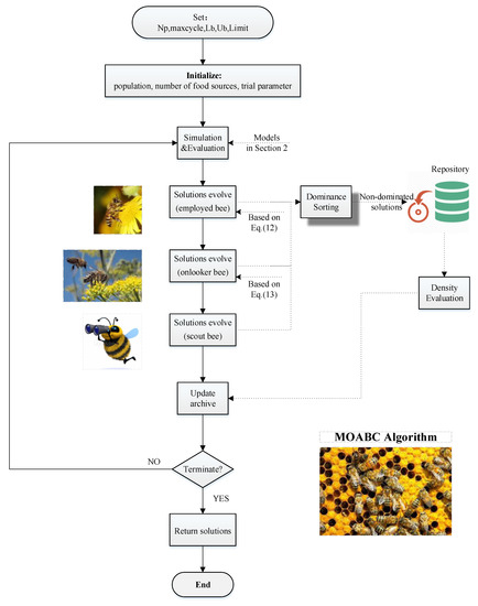 The flow chart of the artificial bee colony algorithm is shown in Figure 7. For more details and demos of MOABC, please refer to [,].
