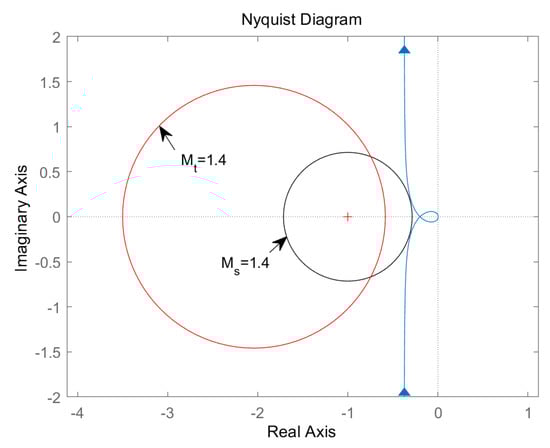 where is the open-loop transfer function of the control system. The robustness index physically represents how significantly the closed-loop control system will vary in the presence of open-loop modelling perturbation []. Considering traditional frequency domain analysis, the index represents the reciprocal of the distance between the frequency response curve of the open-loop transfer function and the point (−1, j0). The smaller the index is, the farther the distance from the critical point, and the better the robustness.