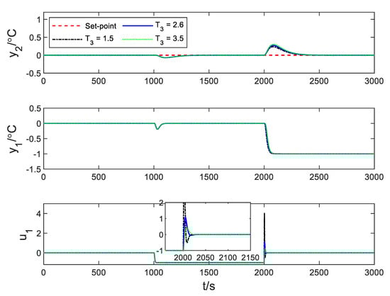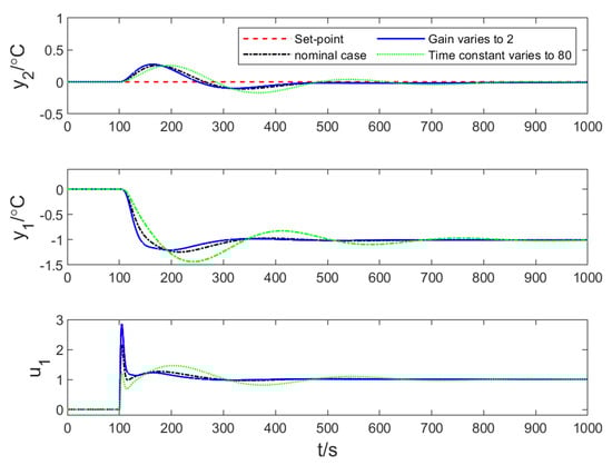Similarly, simulations are made under the nominal case and model mismatch cases for the outer-loop. Two model mismatch conditions for are considered: process gain varies from 1.5 to 2 and time constant varies from 60 to 80. The simulation results are shown in Figure 21. A unit step disturbance is added at 100 s.