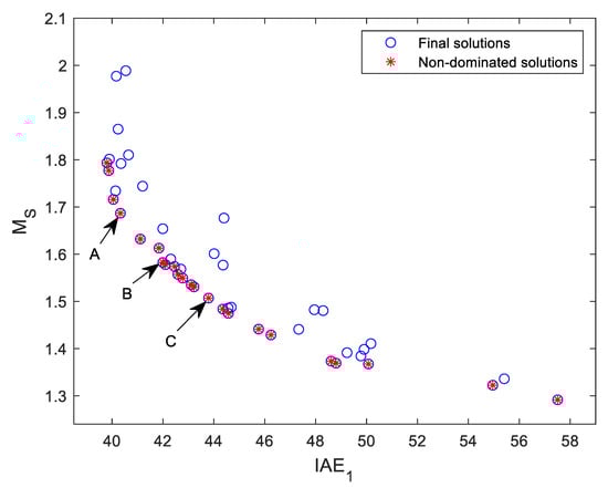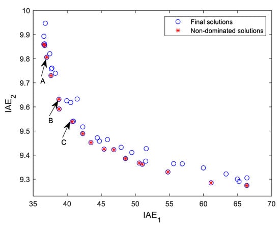It can be seen that, there is little difference between the three PI controllers, due to the strong disturbance rejection ability of cascaded DOB. The selected solution ‘B’ is the control parameter that has the minimum IAE index under the certain robustness index ().