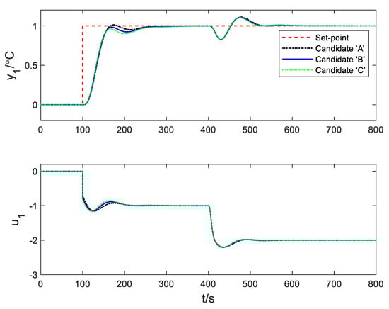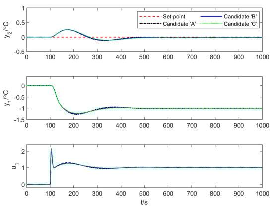 The following figure shows the relevant simulation results, in which a unit step disturbance is added at 100s (Figure 17). The controller parameters and related indicators of the three non-dominated outer-loop controllers are shown in Table 2.