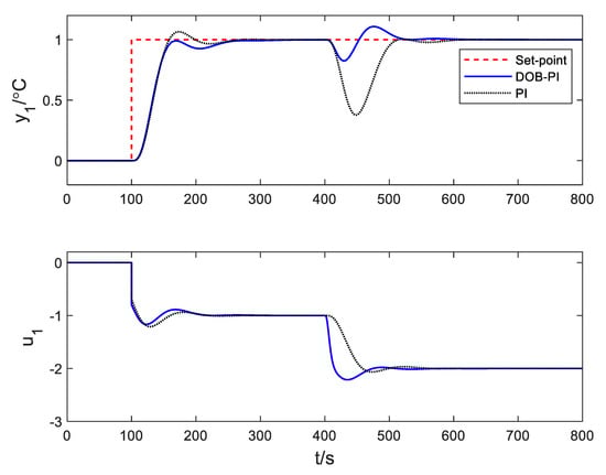 The same simulation is carried out using the optimized DOB-PI and PI controller parameters. The results are shown in Figure 18, and the related indicators are shown in Table 3.