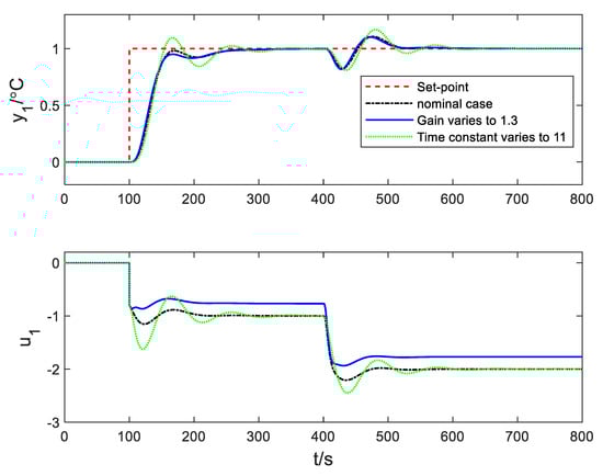 Simulations are made under the nominal case and model mismatch cases. Two model mismatch conditions for are considered: process gain varies from 1 to 1.3 and time constant varies from 9 to 11. The simulation results are shown on Figure 20. A unit step command disturbance and disturbance are added at 100 s and 400 s, respectively.