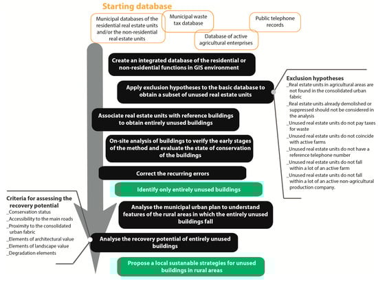 The next phase (6) of the method involves analyzing the municipal urban plan to understand what land uses and rules are envisaged in rural areas where there are unused buildings.