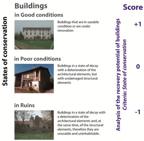 The analysis of these small empty buildings is the first step in their recovery and to help optimize and contain land use and occupation. The problems caused by urban development are intensely investigated, but the solutions are not as widespread and focus on cities [,,,,,,,]. The redevelopment of existing idle buildings—also in the rural area—could be a valid solution in the reduction of free land urbanization and make existing areas newly attractive. It would also reduce the social and environmental risks originating from the presence of degraded areas, would improve the landscape and its perception and generate new jobs in nonresidential areas.