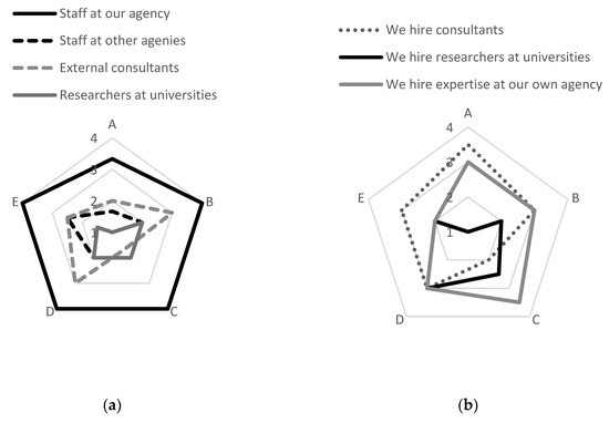 Responses from representatives at five different Swedish state agencies concerning actor involvement in the design and conduct of evaluations. (a) Answers from the questionnaire to the question “Who partakes in the design of the evaluations that you either commission or conduct at your agency?” (b) Answers from the questionnaire to the question “Which actors do you hire when you commission an evaluation?” Results show the mean value reported by informants from each agency (A–E), where 1 is “never” and 4 is “always”.