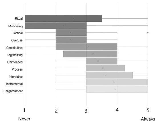 A word is warranted on instrumental use in particular, as it was one of the models of use that received one of the overall highest ratings among the 11 models in this study. While this model is noted by scholars as not very prominent in reality [24], due to its rather direct approach to use which contrasts with the complexity of a real policy process [29,48], it has been shown to be applied in the European Commission, for example, in decision-making based on legislative evaluations, even under political opposition [31], or as indirectly applied as evaluation findings inform policy development ex-ante [49]. Thus, while the results of this study at first glance may seem idealistic and to showcase a mere vision of what the use of evaluation could be, they should be considered against the fact that instrumental use is not altogether disregarded in practice.