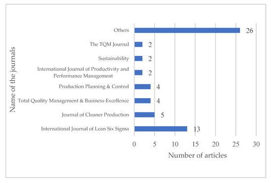 The number of articles (in GLSS domain) published in the peer-reviewed journals can be observed from Figure 4. The chart clearly indicates that the maximum number of articles were published in the International Journal of Lean Six Sigma with 13 articles which is 22.41% of the total published articles, followed by Journal of Cleaner Production with five articles (8.62%). Production Planning and Control and Total Quality Management & Business Excellence contributed with four articles (6.89%) each. Additionally, The TQM Journal, Sustainability, and International Journal of Productivity and Performance Management also contributed with two articles (3.44%) each. The “Others” category in Figure 4 represents journals with single article publication.