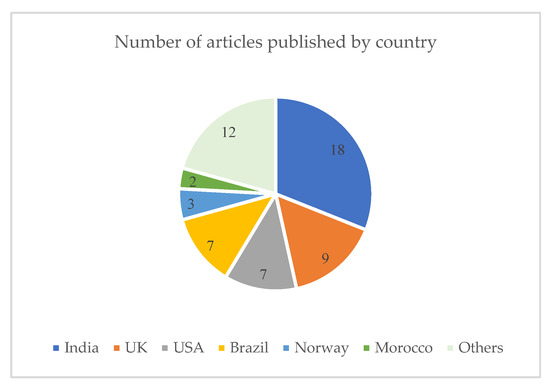 With the increasing ecological awareness, both developed and developing countries are focusing towards the environmental performance in their organizational operations. Figure 5 shows a pie chart distribution of articles by country. It shows interesting results in this regard as most of the articles were published by a developing country, India, with total 18 articles (31.03%), followed by the UK with nine articles (15.52%). Further, there were seven articles (12.07%) published by the USA and Brazil each, followed by Norway (5.17%) and Morocco (3.45%). In the chart, 12 articles appear under “Others” category which are single publications from several countries.