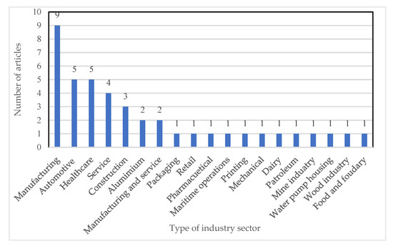 The distribution of the articles by industry sector is shown in Figure 6. It is clear that manufacturing is the prominent industrial sector (with nine articles) with most GLSS research. Then automotive industry along with healthcare have contributed with four articles each, followed by construction with three articles. Both aluminum and manufacturing and service industries have also contributed with two papers each. All other industrial sectors have single publications. The above classification of different industrial sectors is consistent with Parmar and Desai [3] in which automobile, construction, pharmaceutical, and petroleum industries were considered separate from manufacturing.