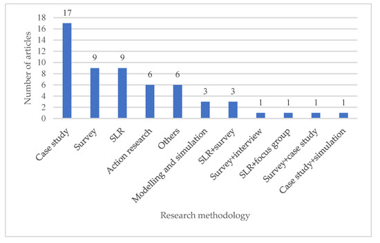 The articles classification by research methodology is given in Figure 7. Various approaches have been utilized in GLSS research such as case study, survey, action research, modelling and simulation. There are articles that have utilized more than one method such as SLR and survey, survey and interview, survey and case study, and case study and simulation. The research articles that do not fit in the above categorization are kept under the “Others” category including literature review articles.
