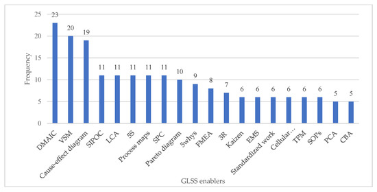 GLSS enablers are a combination of various tools and techniques of green, lean, and six sigma that are utilized to enhance the execution of GLSS strategy. These tools are capable of identifying and removing environmental wastes along with achieving resource conservation objectives [22]. Figure 8 highlights GLSS tools in organizations according to their requirements and characteristics. The most frequently utilized tools are DMAIC, VSM, SIPOC, LCA, 5S, cause-effect diagram, pareto diagram, 5whys, 3R, EMS, FMEA, process maps, work standardization, and Kaizen. Findings highlight that these tools are mostly used under DMAIC methodology.