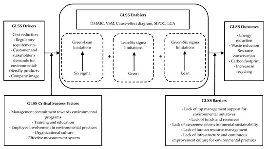 Few studies have identified the theoretical constructs of a GLSS approach such as drivers, critical success factors (CSFs), tools and techniques, barriers, and outcomes individually [2,22,24,25]. However, there is little research that addresses the above GLSS constructs as a consolidated approach in reducing environmental impacts of organizations [10,19].
