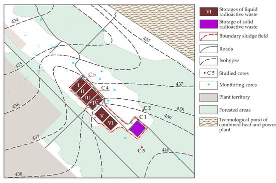The low-level radioactive waste storage from the AECC is located several kilometers away from the Angarsk city border (Figure 1). It is designed for accumulation and precipitation of limewater suspension produced during the neutralization of liquid nitric acid waste from a chemical plant with Ca(OH)2. The facility consists of six near-surface open reservoirs with sizes of 100 × 70 m and 85 × 90 m and 17,000 m3 (reservoirs I-IV) and 18,000 m3 (reservoirs V-VI) in volumes. Reservoirs I and II are filled up to the designed level and covered with a clay liner for the prevention of rainfall and melting snow infiltration. Reservoir III is at the stage of conservation and reservoirs IV-VI are still under operation [].