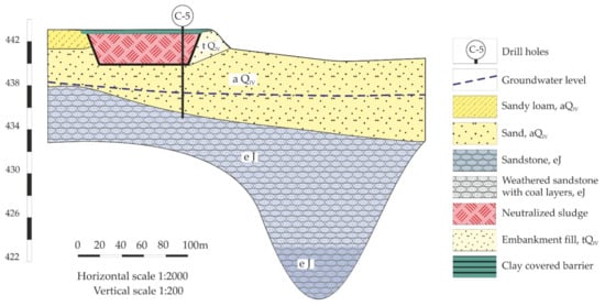According to the research from the Irkutsk geological and ecological survey [], at the moment of two production lines operation, the salinity of waste was not stable and varied from 13 to 31 g/L. The infiltrate was a multicomponent alkaline solution with pH 9.5–11.0. Its major components were chlorides, sulfates, carbonates, bicarbonates, nitrates, and ammonium ion at concentrations from hundreds of mg/L to a few g/L. The most common cations in solution were Na+ (2–3 g/L), Ca2+ (about 0.6 g/L), and K+ (about 0.14 g/L). The distinctive feature of the composition of the waste solution was the absence of magnesium. The foundation soil massif is subdivided into two sections. The first is the zone of aeration that lies within the alluvial sands and sandy loams. The second one is the zone of saturation, which coincides with the weathered crust of the Jurassic sandstones.