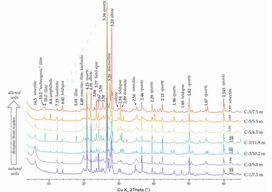 There is a clear change in the diffraction patterns of the transformed soils, in the range of 3–15°2θ. These changes are observed quite clearly in the samples of the lower horizons of well C5 (5.5–7.5 m), which was drilled directly through the maps and sedimentary rocks, which are affected by technogenic waters.