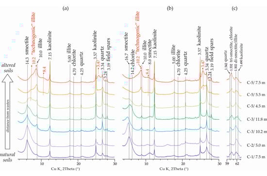 XRD patterns in the (060) part indicate that the visible changes in the composition of di- and tri-octahedral clay minerals in the transformed sands in comparison with the background soils may be caused by changes in the composition of the original soils and cannot be attributed to technogenic changes. At the same time, changes in the XRD patterns from clay fractions (Figure 4) in the small-angle region are obvious and can be observed not only in the deeper horizons (5.5–7.5 m) of the well 5, as noted above, but also in the horizon 4.5 m of the well C5 and in the lower horizon (11.8) of the well C3. Samples C1/7.5, C3/5.0, and C3/10.2 can be classified as sands that have not undergone visible alterations due to the impact of industrial waters.