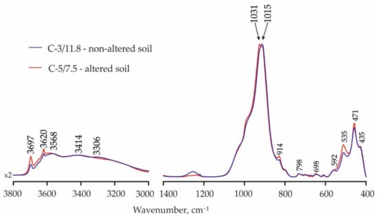 The infra-red (IR) spectroscopy data of the fine fractions of non-altered C-3/11.8 and altered C-5/7.5 soil samples show the polymineral composition: predominantly dioctahedral smectite, chlorite (or mixed-layer minerals with chlorite layers), and kaolinite. Identification of minerals was performed in accordance with recommendations of [,]. Wavenumber values and profiles of the absorption bands in the IR spectra (Figure 5) for both samples are similar; the noticeable difference is caused only by a higher content of kaolinite in the altered soil specimen. The IR-spectroscopy data show that there are no “illitic” phases in the altered sample, otherwise, there would be a small band at ≈ 420 cm−1 on the spectra [].