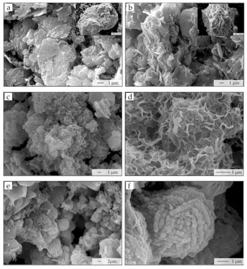 Microstructures observed with a scanning electronic microscope are quite typical for weathered sandstones. Quite large isometric particles and aggregates of dense clay particles (probably kaolinite, illite, and smectite) and thin openwork smectite domains are clearly visible (Figure 6 a,b).