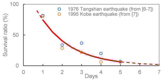 For example, when an earthquake occurs, many people are instantly killed or hurt, and some are buried in collapsed buildings. For those seriously injured, their wounds can quickly deteriorate and become fatal if they are not rescued and given medical care in time. Generally, the survival rate of victims decays rapidly [6,7], as indicated by the two fatal earthquakes in Figure 1. On average, the survival ratio of people rescued within 24 h after an earthquake is 74%, while it is 22% on the third day and 6% on the fifth day. This decline in survival ratio is also affected by the collapse of buildings and the health status of victims [8,9]. Nonetheless, the first 72 h [10] are considered the most critical with regard to current practices.