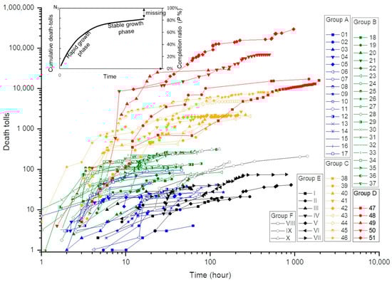 To emphasize the differences in SAR efficiency among different magnitudes of death tolls, disasters were categorized according to these magnitudes, as shown in Table 1; the death toll curves are shown in Figure 2. The death tolls and the corresponding time are presented mainly according to announcements by the relevant authority for disaster response, obtained from the China Earthquake Database or the media. Group A represents earthquake disasters with less than 100 fatalities, plotted in blue; Group B represents earthquake disasters with 100–1000 fatalities, plotted in green; Group C represents earthquake disasters with 1000–10,000 fatalities, plotted in yellow; lastly, Group D represents earthquake disasters with > 10,000 fatalities, plotted in red. In general, the cumulative death toll initially increased rapidly. With time, not only did the probability of recovery decrease, but the number of people found also decreased. Subsequently, the SAR efficiency decreased gradually. Tang et al. [16,21] highlighted that the death toll curves reported in earthquakes have two phases: a rapid growth phase and a stable growth phase.