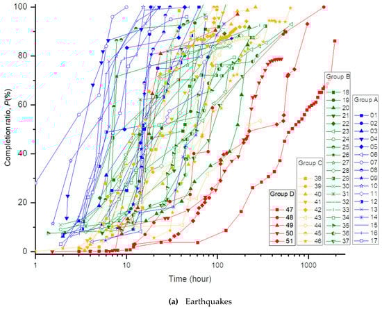 The death tolls of the 51 collected earthquake events were converted into completion ratios (cumulative death toll (N) divided by the final death toll (NT)). Sometimes, not all of the victims are found upon completion of SAR work; hence, the completion ratio may not always reach 100%. Herein, generally, the curves showed an inverse relationship between magnitude and completion ratio. The completion ratio curves for rainfall-induced disasters are shown in Figure 3b.